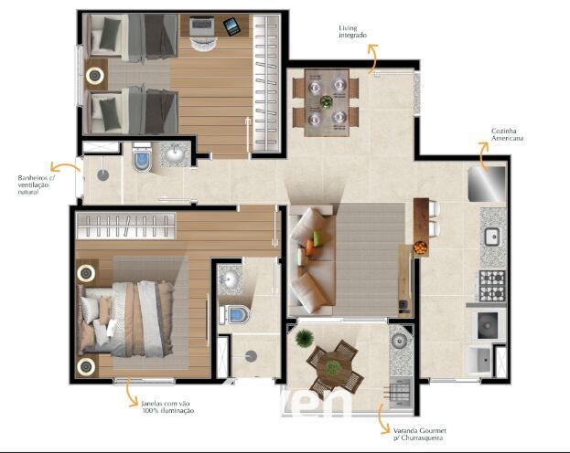 2 Dormitórios, sendo 1 suíte2 Banheiros1 VagaGaragem Coberta1 Cozinha1 Sala de jantar1 Sala de estar1 Área de serviço