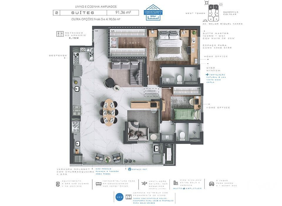 2 Dormitórios, sendo 2 SuítesGaragens