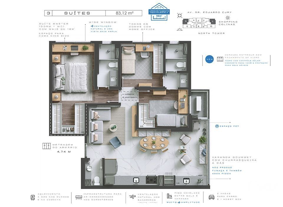 3 Dormitórios, sendo 3 SuítesGaragens