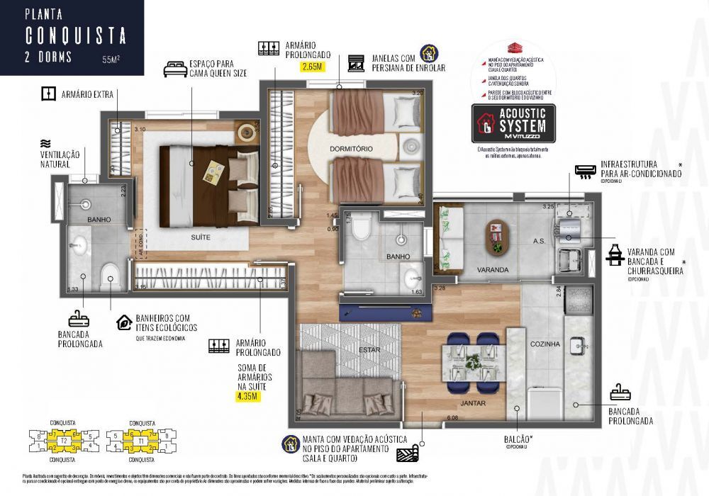 Apartamento de 55m² com 2 dormitórios sendo 1 suíte, banheiro social, sala ampla com 2 ambientes integrados, cozinha americana integrada, varanda gourmet com churrasqueira, área de serviço, 1 vaga de garagem coberta e um maravilhoso condomínio com lazer completo e muito bem localizado no Parque Industrial.