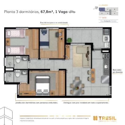 Belíssimo lançamento de 67,80m² com 3 dormitórios sendo1 suíte ampla, banheiro social, sala de estar integrada à sala de jantar, cozinha espaçosa em conceito aberto, varanda ampla integrada à área de serviço, opção de inclusão de churrasqueira na varanda, 1 vaga de garagem coberta e um belíssimo condomínio com lazer bem familiar e ótima localização no Parque Industrial.