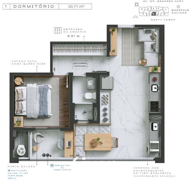 Apartamento á venda de 50m² com 1 quarto, banheiro social, sala de estar integrado a sala de jantar, ampla cozinha, área de serviço, sacada, área gourmet com churrasqueira, 1 vaga de garagem e um excelente localização ao lado do Shopping Colinas.