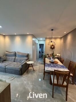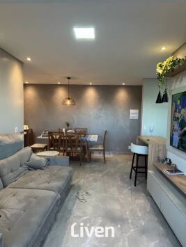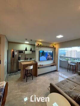 Apartamento à venda de 67m² com 2 quartos sendo 1 suíte, banheiro social com box em vidro e gabinete, sala de estar integrado à sala de jantar, linda cozinha americana, área de serviço, sacada com cortina de vidro, imóvel repleto de armários planejados de ótima qualidade, 1 vaga de garagem coberta e uma excelente localização.