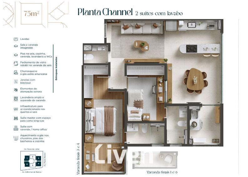Belíssimo lançamento com apartamentos de 75m² com 2 suítes muito bem distribuídas, suíte máster com varanda/home office, lavabo social, sala de estar integrada à sala de jantar, cozinha americana com churrasqueira à gás, varanda integrada à sala, área de serviço, 2 vagas de garagem cobertas e um maravilhoso condomínio com lazer muito familiar e uma ótima localização na Vila Adyana, zona central de São José dos Campos.
