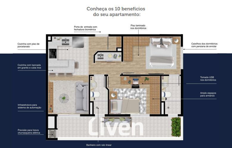 Apartamento à venda de 59m², 2 quartos sendo 1 suíte, banheiro social, sala de estar integrado a sala de jantar, cozinha americana, área de serviço, sacada, área gourmet com churrasqueira, 1 vaga de garagem, empreendimento com lazer completo e uma excelente localização.