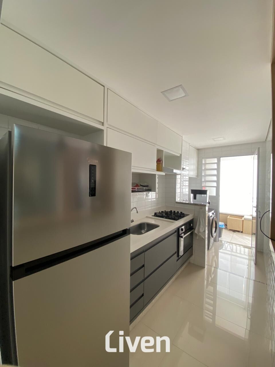 - Cozinha com bancada de madeira e lavanderia