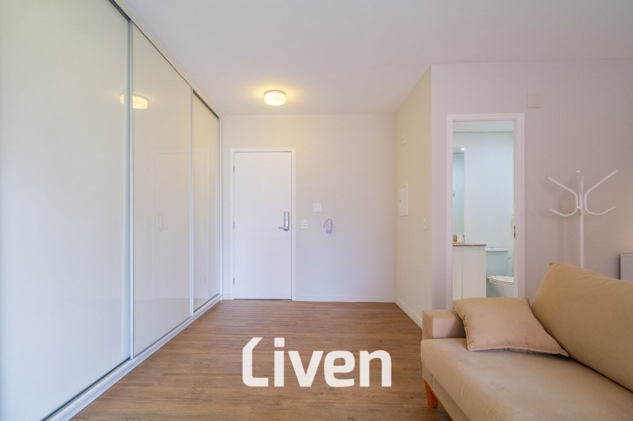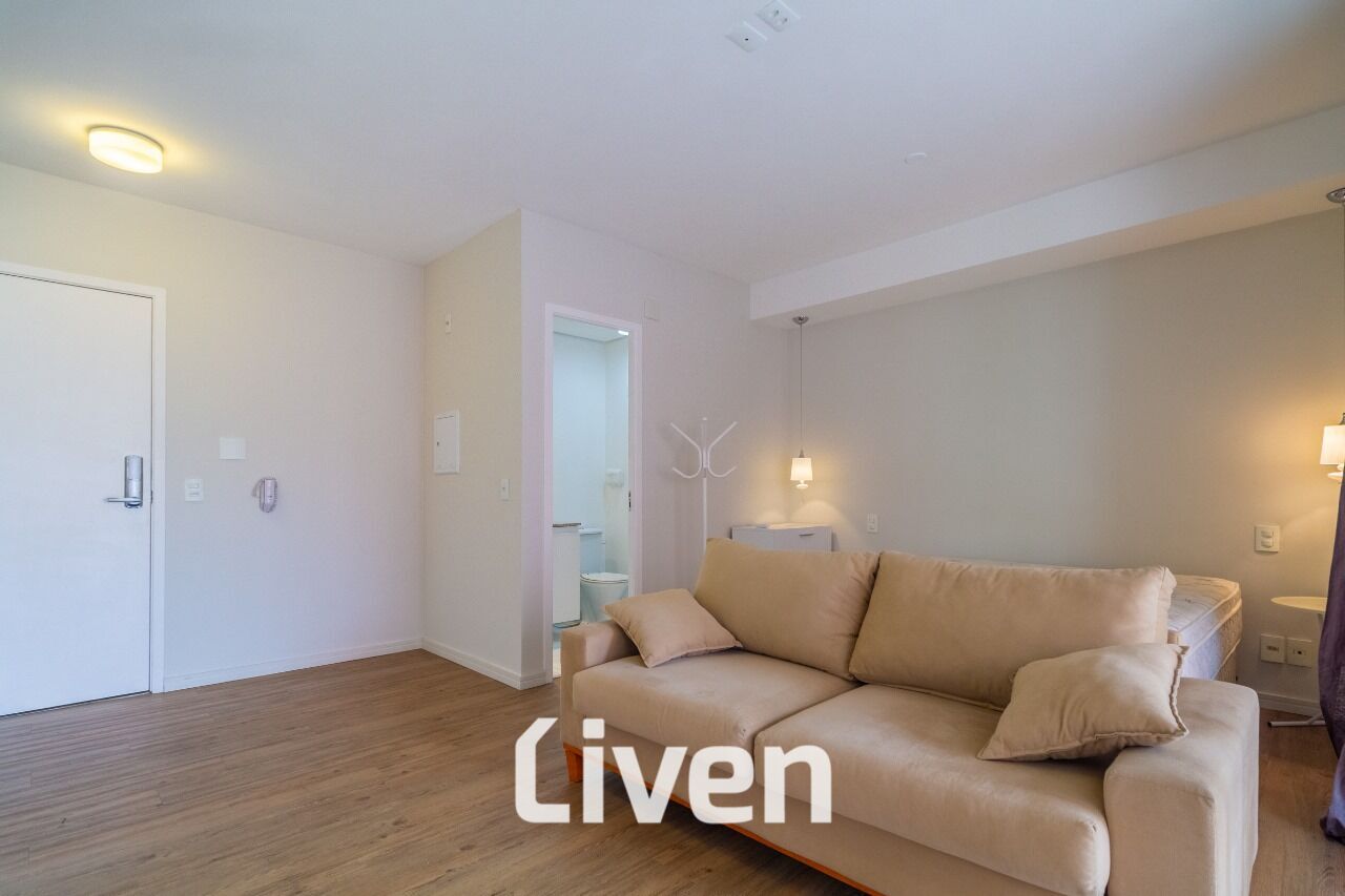 Lindo studio à venda de 40m², 1 quarto, banheiro social com box em vidro e gabinete, sala de estar, sala de jantar, cozinha, sacada com cortina de vidro, imóvel repleto de armários planejados de ótima qualidade, 1 vaga de garagem e uma excelente localização.