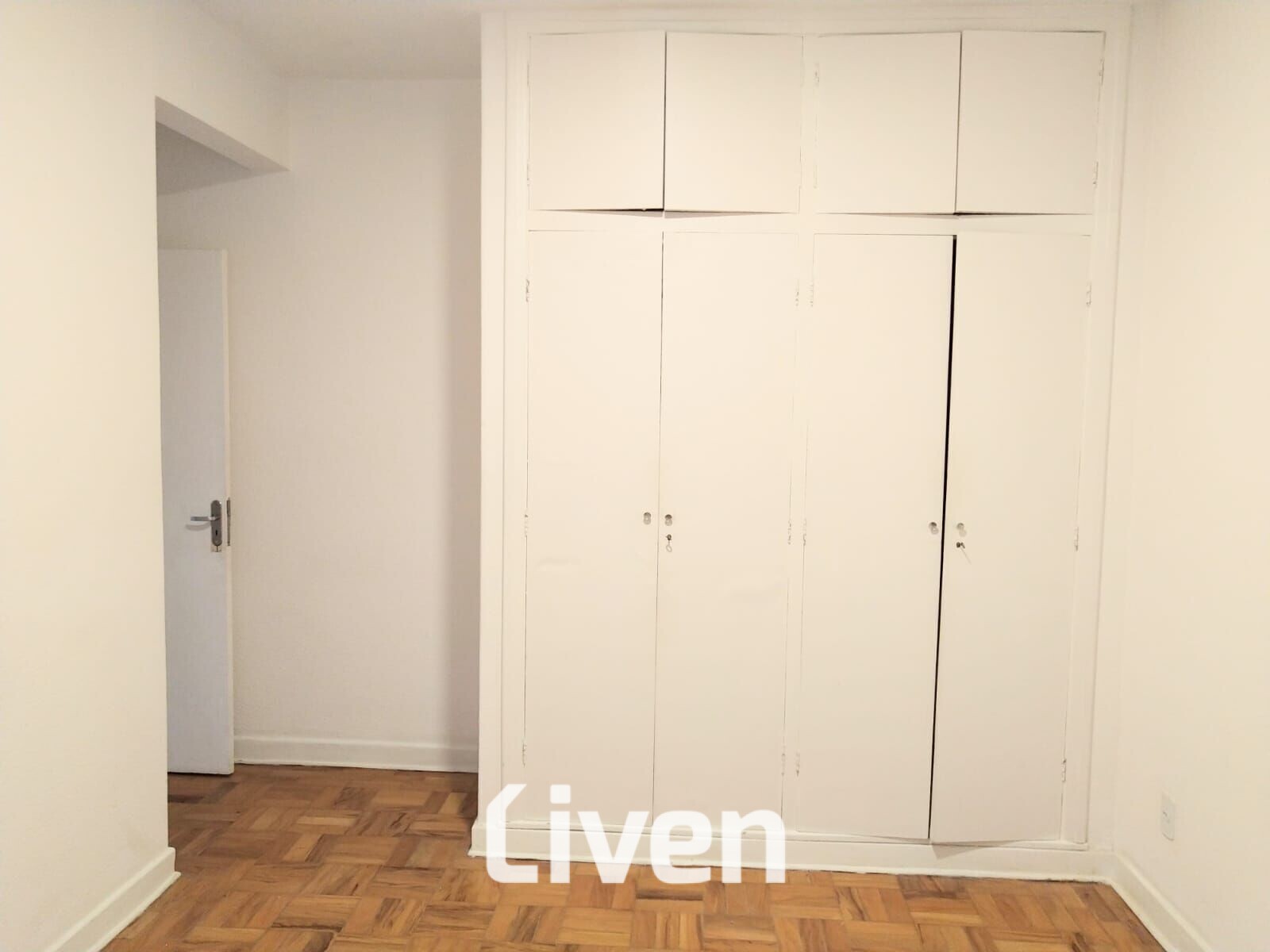 Apartamento de 2 quartos com armário embutido, banheiro, sala, cozinha com armários embutidos e área de serviço.