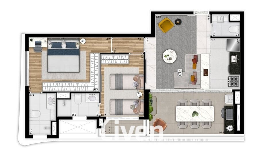 2 Dormitórios, sendo 2 suítes3 Banheiros1 Vaga1 Cozinha1 Sala de jantar1 Sala de estar1 Área de serviço