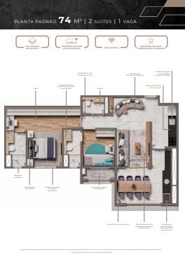 2 Dormitórios, sendo 2 suítes2 Banheiros1 VagaGaragem Coberta1 Cozinha1 Lavabo1 Sala de jantar1 Sala de estar1 Área de serviço