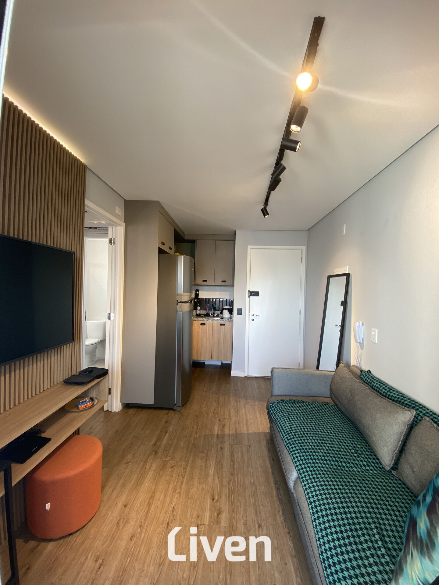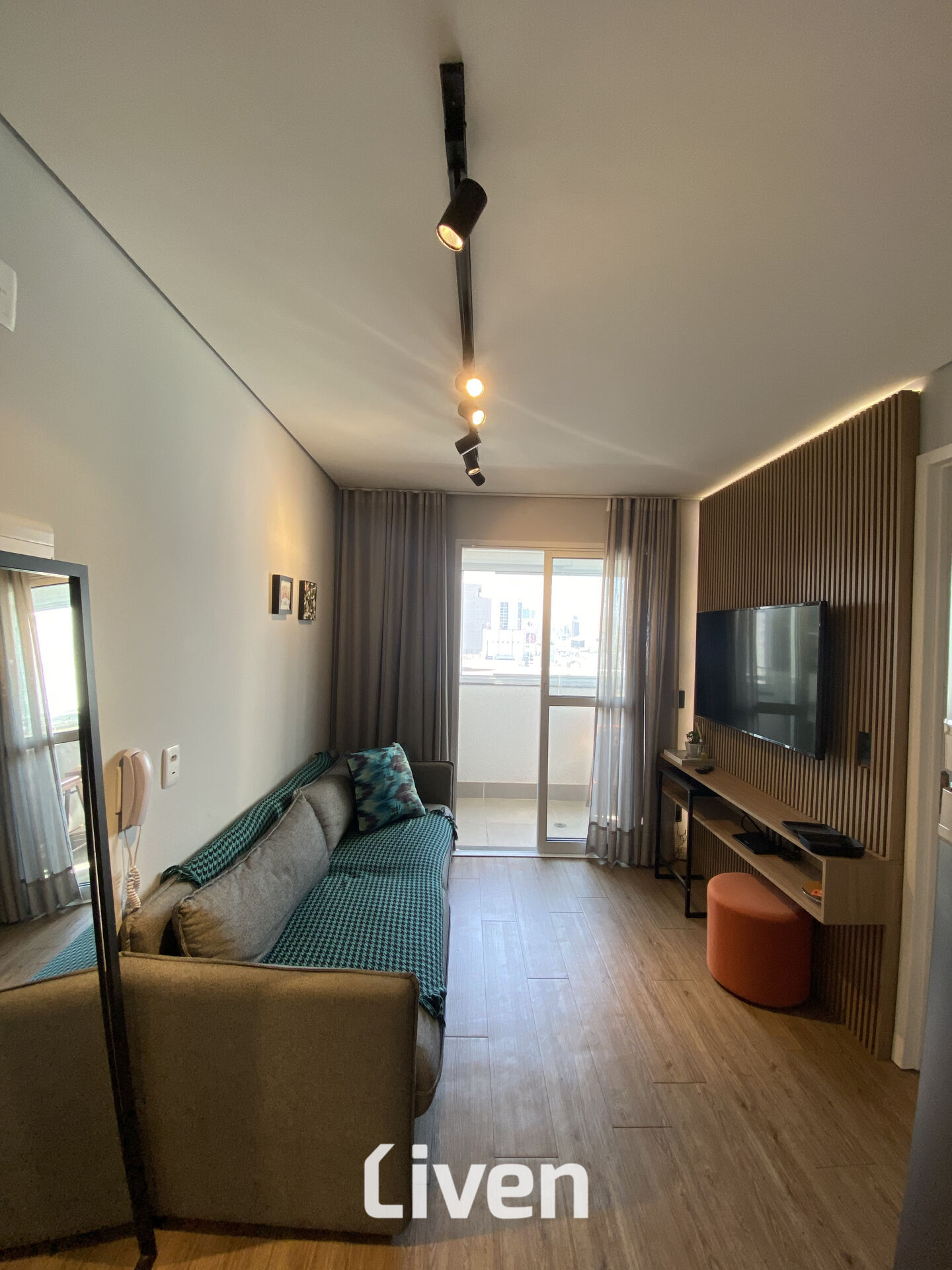 Belíssimo apartamento totalmente planejado de 28m² com 1 suíte bem ampla e muito bem distribuída, banheiro com box em vidro e gabinete, sala de estar bem espaçosa e aconchegante integrada à varanda totalmente fechada com cortina de vidro e vista livre, cozinha americana planejada, ar condicionado, piso laminado, armários de ótima qualidade, incidência do sol da manhã e um condomínio muito bem localizado na Bela Vista, zona central de São Paulo.