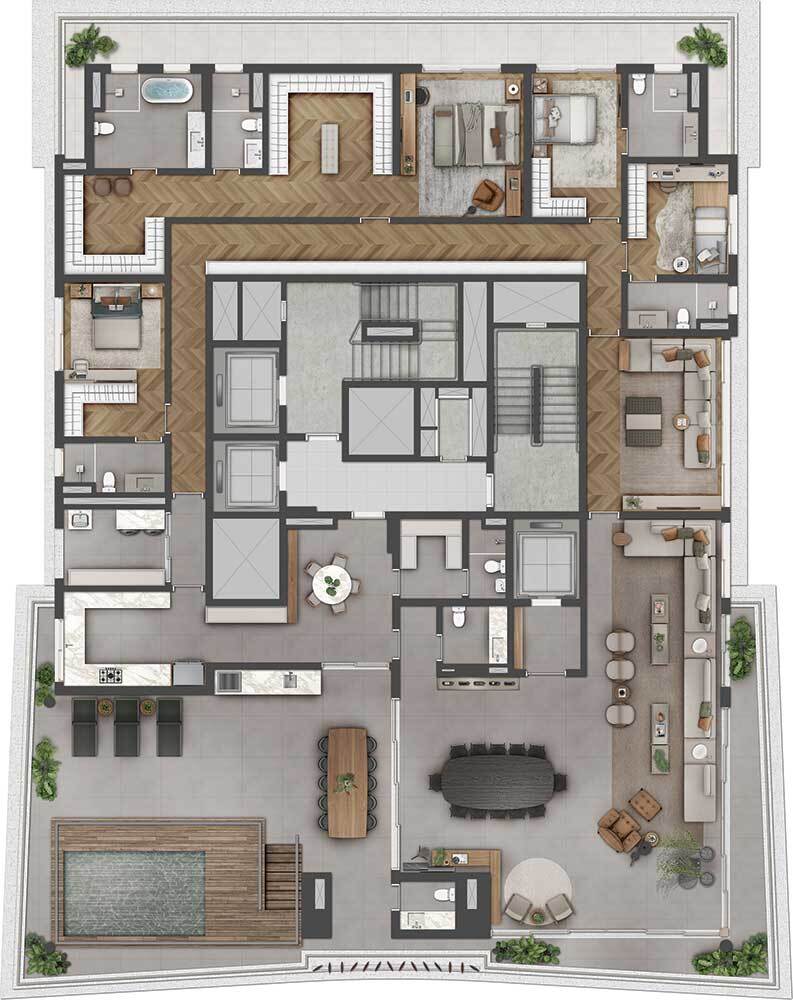 Cobertura penthouse maravilhosa de 520m² com 4 suítes bem amplas sendo 1 suíte máster com 2 banheiros e 2 closet`s, terraço íntimo, sala de TV, ampla sala de estar integrada à sala de jantar, lavabo social, copa integrada à ampla cozinha, despensa, banheiro de serviço, maravilhoso terraço com área gourmet e piscina privativa, lavabo, área de serviço, hall privativo, 6 vagas de garagem cobertas e um maravilhoso condomínio com área de lazer completa e uma ótima localização no Brooklyn, zona sul de São Paulo.