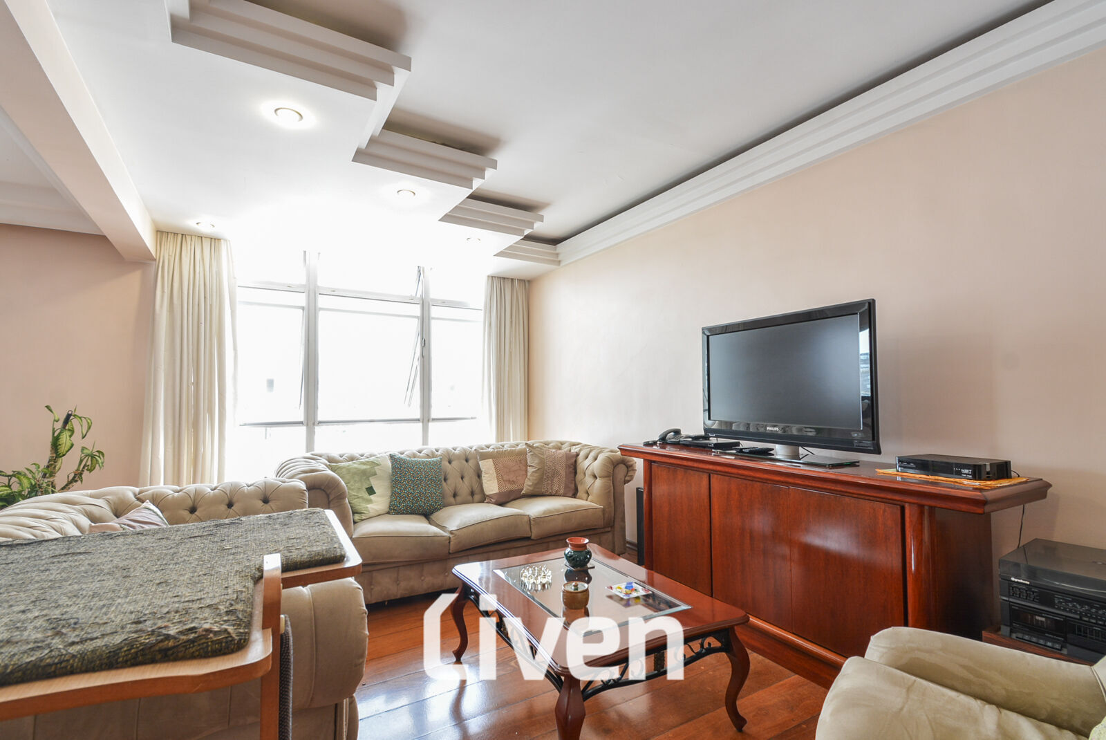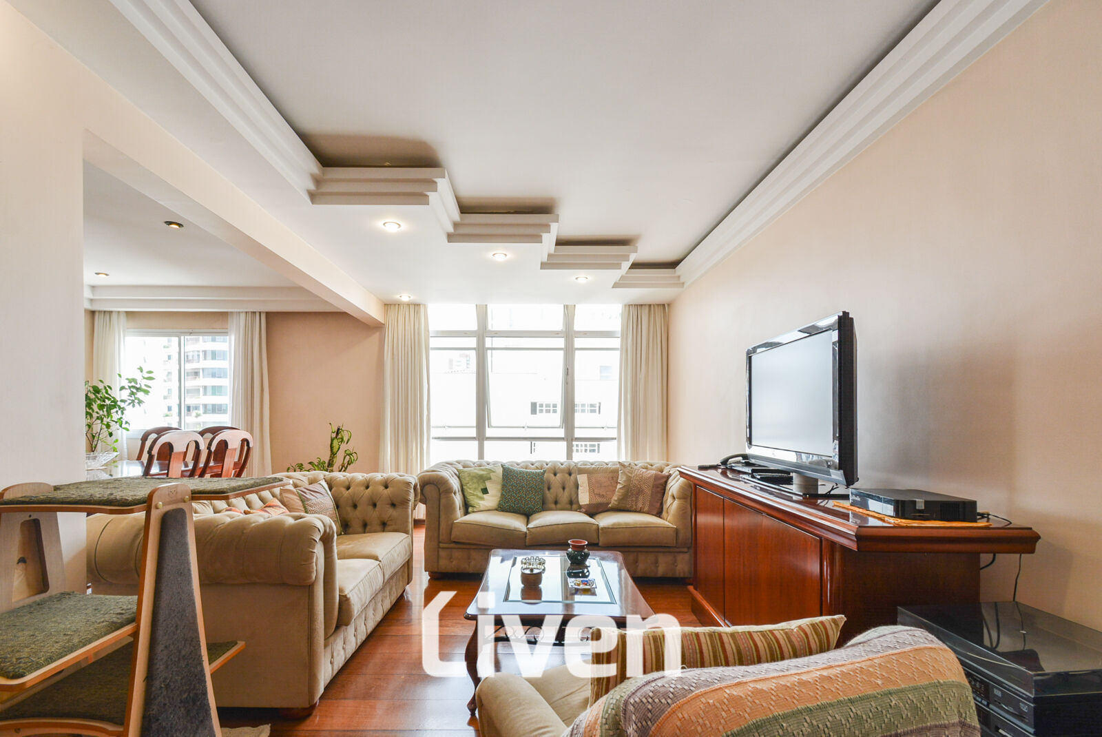 Já na sala de estar você encontra um espaço generoso em tamanho e dividida em dois ambientes, proporcionando flexibilidade para criar áreas de convivência e entretenimento. Grandes janelas permitem a entrada abundante de luz natural, iluminando o ambiente e criando uma atmosfera arejada e convidativa.