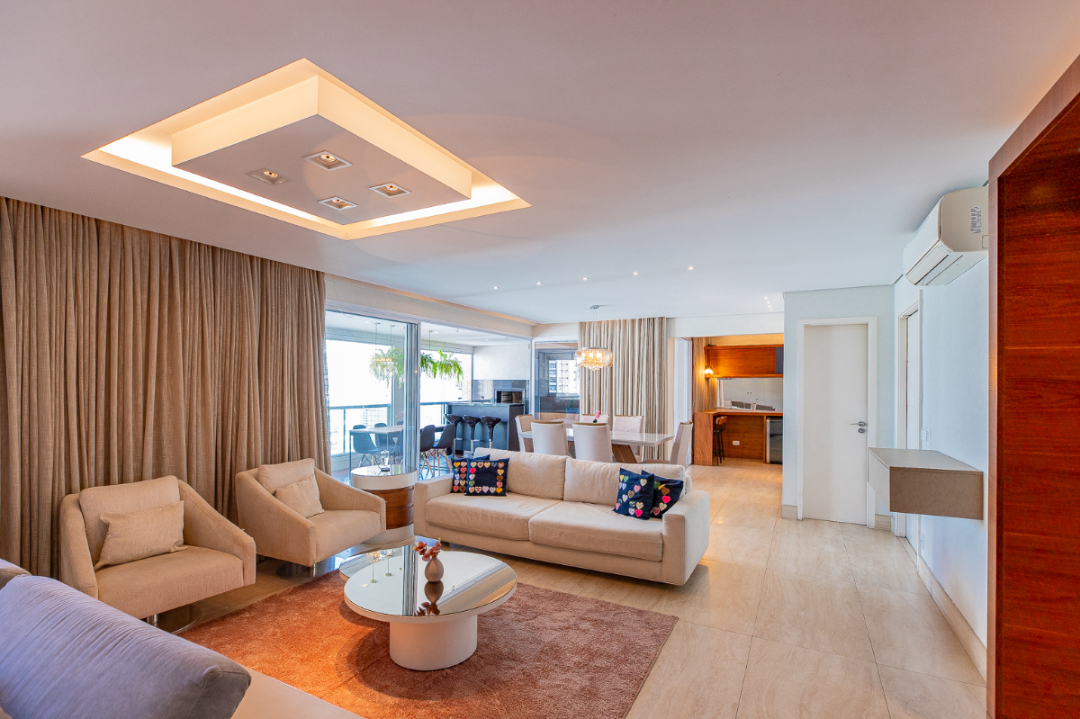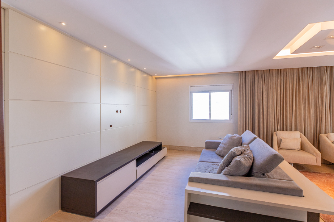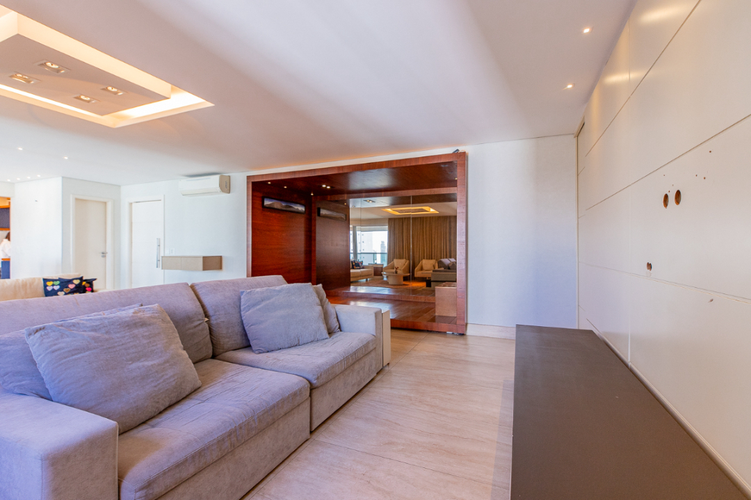 Apartamento de 194m² em andar alto, com living para 2 ambientes, lavabo, varanda gourmet com churrasqueira e forno de pizza, sala de TV e 3 suítes (master com closet, ofurô e 2 chuveiros), todas com ar-condicionado. Cozinha planejada, copa, área de serviço e 4 vagas fixas. Condomínio completo com piscinas aquecidas, quadra de tênis, spa, academia, salões, brinquedoteca e aulas inclusas no valor.