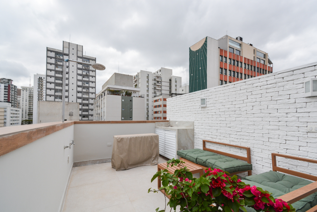 Cobertura 80m², 1 dormitório com sacada, ar condicionado, cozinha planejada com armários, banheiro social, na parte de cima conta com uma sala para 2 ambientes e um terraço bem espaçoso para o seu lazer, 1 vaga de garagem, condomínio conta com jardim ,gerador e portaria 24 horas, além de ser muito bem localizado no bairro Jardim Paulista próximo a avenida paulista e a estação de metrô Brigadeiro.
