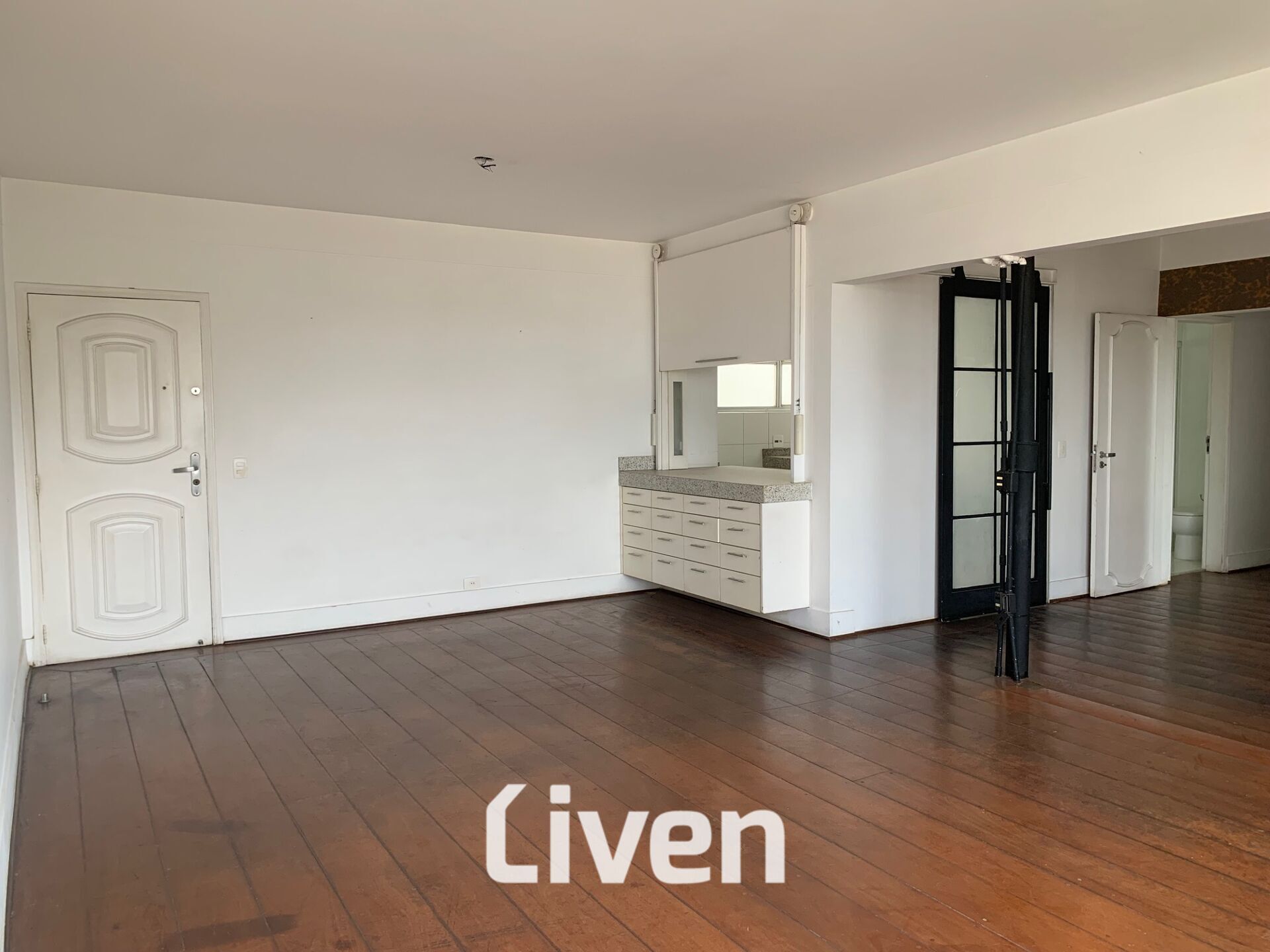 Destaca-se que um dos dormitórios foi aberto para a sala, mas pode ser facilmente revertido, bastando fechar a parede novamente. Da mesma forma, a cozinha possui uma abertura parcial para a sala, permitindo uma integração entre os espaços.