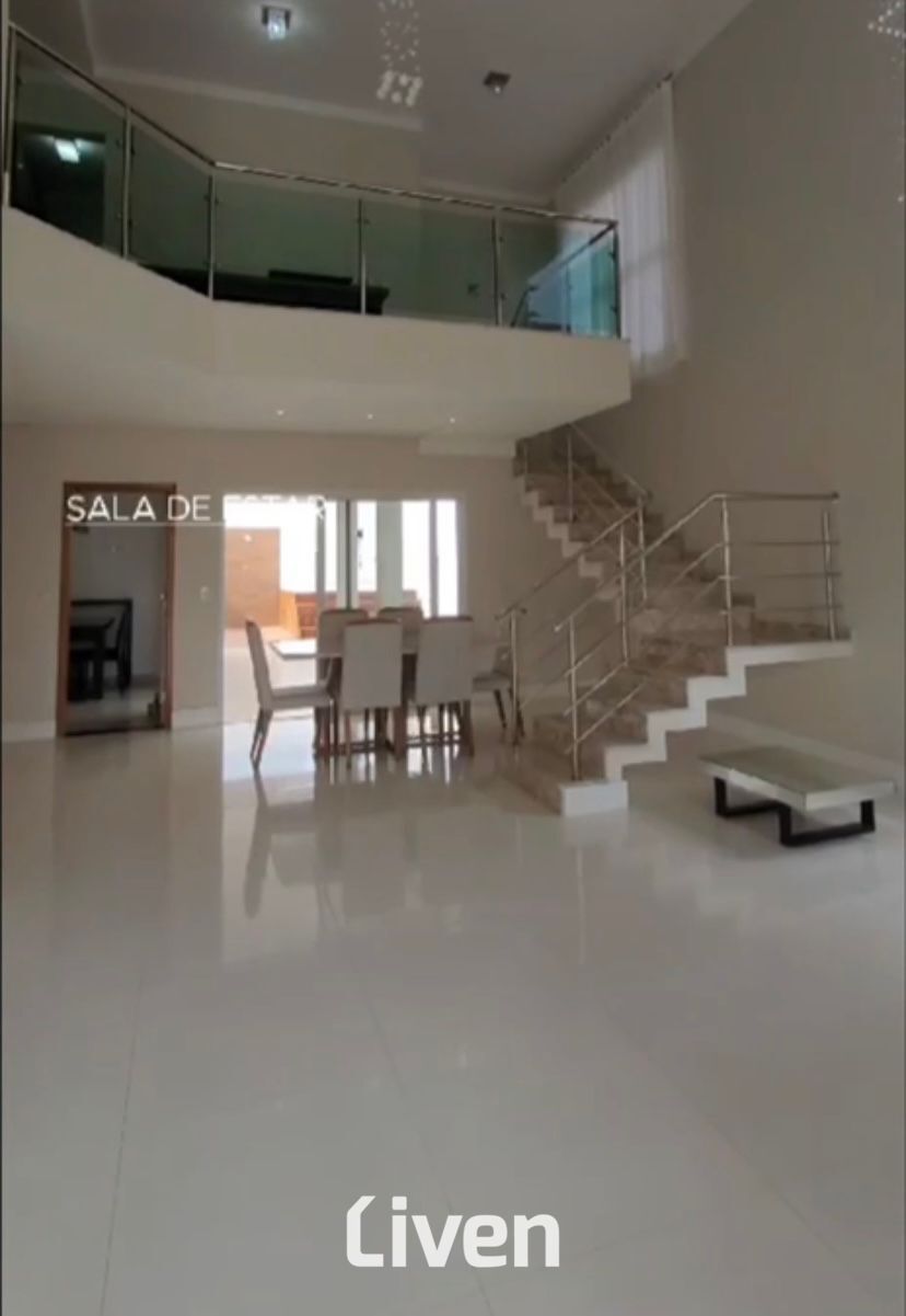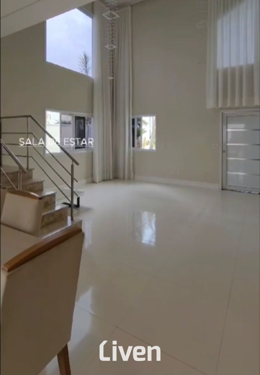 Sobrado à venda em condomínio de 296m² com 3 suítes sendo a principal com closet e banheira, banheiro social com box em vidro e gabinete, ampla sala de estar integrado a sala jantar, sala de tv, cozinha americana, escritório, lavabo, área de serviço, quintal espaçoso, banheira de hidromassagem para 5 pessoas, área gourmet com churrasqueira, imóvel repleto de armários planejados de ótima qualidade, 4 vagas de garagem sendo 2 cobertas e uma ótima localização.