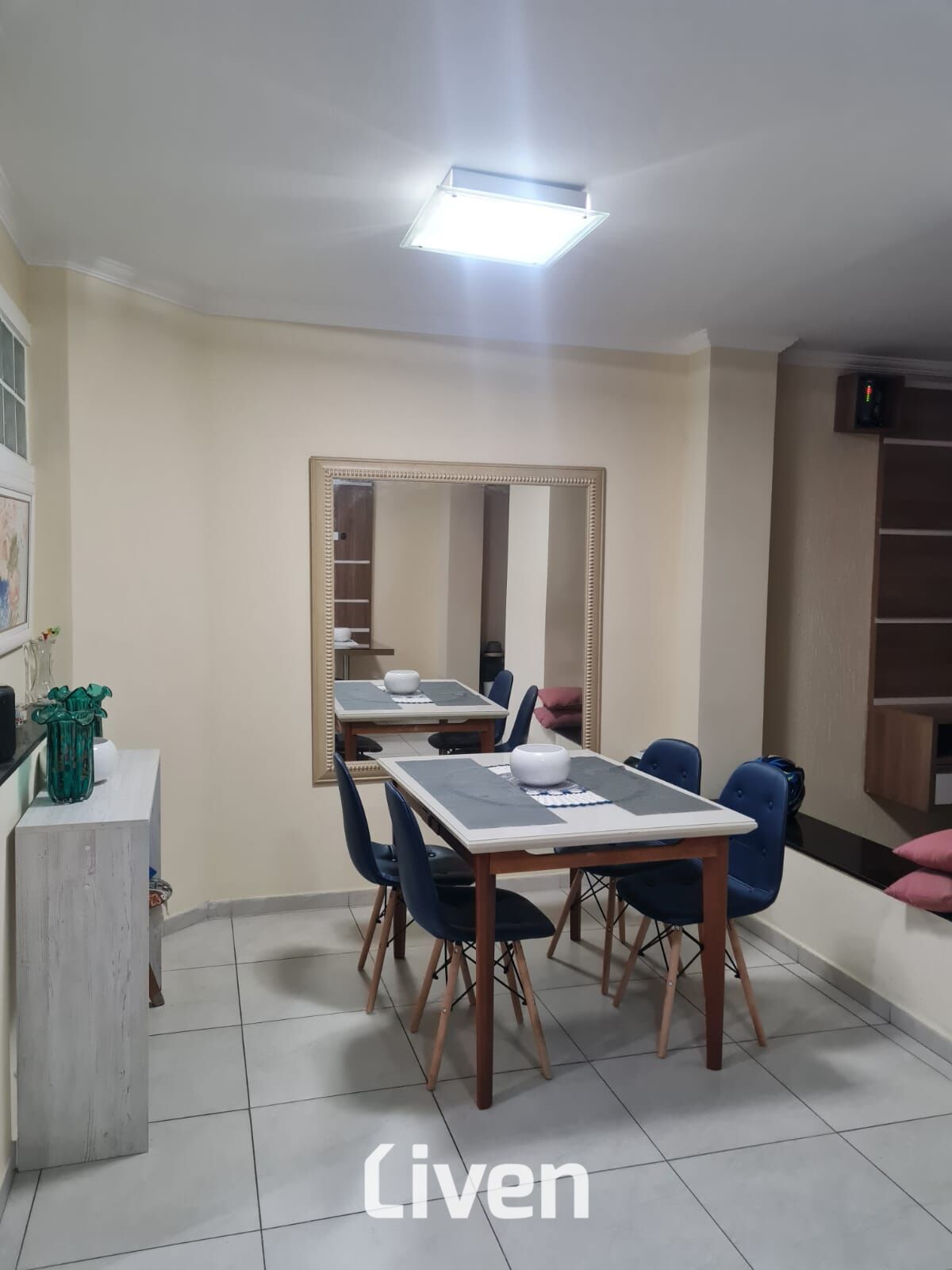 Cozinha planjeada, sala de jantar, sala de estar, copa, área de serviço e varanda.