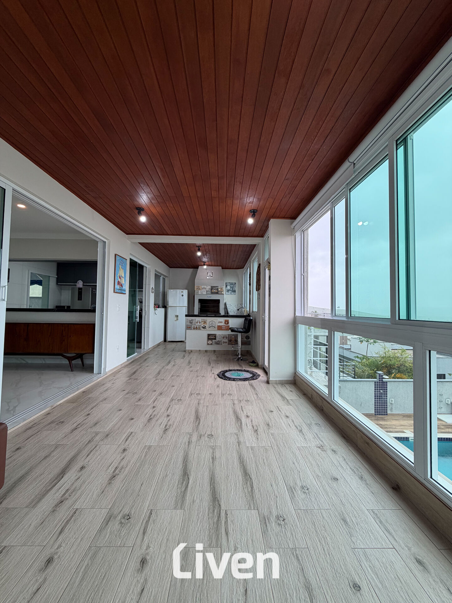 -Área Gourmet com churrasqueira, bancadas de apoio em porcelanato e espaço para sofás e mesa;
